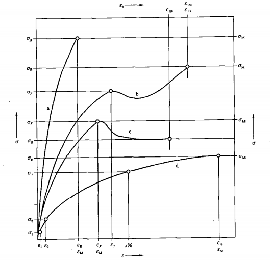 a-脆性材料,b和c-有屈服点的韧性材料,d-无屈服点的韧性材料