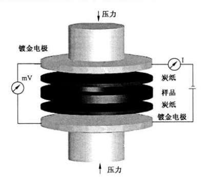 接触电阻测试:电极为镀金铜电极,测试时扩散层碳纸作为试样两侧支撑物,压力每增加0.1MPa进行一次测试,直到两次变化率≤5%;取出样品后剩下装置分别测试不同压力下的电阻值。