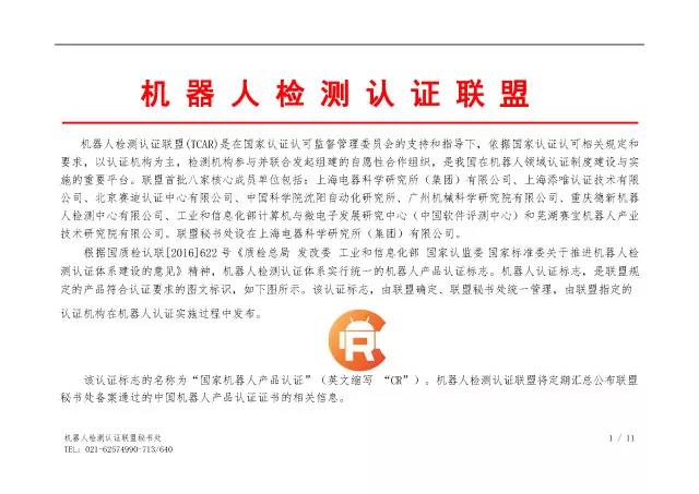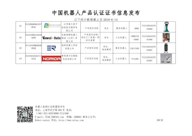 【信息发布】中国机器人产品认证证书信息发布(2018-6-14)