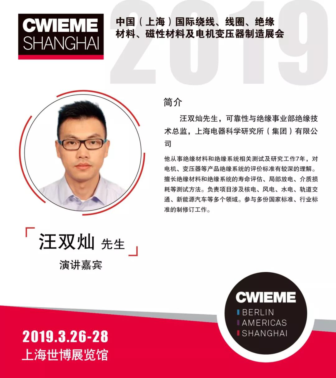 尊敬的客户, “2019中国(上海)国际绕线机、线圈、绝缘材料及电机制造展览会”将于2019年3月26日-28日在上海世博展览馆召开。我们将参加此次展览会(展位号:J24)。中国现已成为世界第一汽车生产国与消费国,伴随着城市化、工业化的飞速发展,原油供求矛盾和全球化变暖的大背景下,节能减排,降低能源依赖已成为汽车工业发展趋势,新能源汽车及其相关产业开始面对在需求及政策利好下的技术变革竞争。本次展会为了解决新能源汽车行业所面临的电机绝缘结构及汽车电气设备可靠性而进行相关的探讨,将借此次盛会举行“第三届新能源汽车用电气产品可靠性与绝缘评定技术研讨会”,在此诚邀您参加,期待您的莅临。