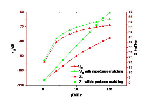 当使用匹配电路进行测试时候,得到的测试结果如图4所示,从图中可以看出,带有匹配电路的测试值与没有匹配电路的测试结果相比高一些。随着频率的增加,差异变得越来越明显。这是因为在高频下,需要考虑波传播过程,在没有匹配电路的情况下,更多的能量被反射掉,因此测得的值相对较低。