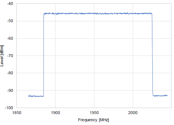 利用以上方式发出了1885~2025MHz,模拟带宽140MHz的信号,图6,显示了使用测量接收机(AV检波器、120kHz分辨率带宽、频率步进50kHz)测量的频谱,表明可以实现相关的宽带测试信号。