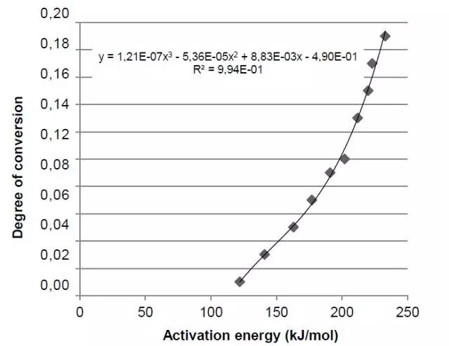 高分子材料温度指数的评定常规法和快速法技术专家李园园上海电器设备检测所 有限公司可靠性与绝缘事业部绝缘实验室经理工作方向从事绝缘材料和绝缘系统的检测技术研究以及相关标准的制修订工作1、温度指数的定义从耐热性关系推出的时间为20000h(或其他规定时间)时的摄氏温度的数值。(耐热图:一种表示耐热性试验中达到规定终点时间的对数与热力学(绝对)试验温度倒数关系曲线图)2、温度指数评定的重要性 长期运行的电气设备发生故障一般为绝缘性故障。通常情况下温度是作用于电气绝缘材料(EIM)的主要老化因子,因此绝缘材料的使用可靠性一般用其温度指数或热寿命进行评定。研究表明长期高温使用会严重损坏绝缘材料的绝缘性能,发生绝缘故障。为防止电气设备因绝缘材料高温老化发生故障,电气设备制造过程中需根据绝缘材料的温度指数或耐热等级选择合适的绝缘材料,因此,绝缘材料的温度指数评定至关重要。3、温度指数评定原理 阿仑尼乌斯方程是用以评定关于化学反应速率与温度之间的关系,热氧化分解过程可以用阿仑尼乌斯方程进行表述:对于绝缘材料,不同种类的分解试验决定了材料机械性能、电性能等与时间的依赖性,因此在绝缘材料温度指数评定中假设温度引起预设性能变化所需的时间的对数与相对应的绝对温度的倒数之间存在这线性关系,及Arrhenius关系,即关系式如下:此方程反映了温度和寿命之间的关系,通常被称为绝缘材料的寿命方程 4、常规温度指数评定 绝缘材料常规温度指数评定的依据标准主要有:GB/T 11026.1 -2016 电气绝缘 耐热性 第1部分:老化程序和试验结果的评定GB/T 11026.2-2012 电气绝缘材料 耐热性 第2部分:试验判断标准的选择GB/T 11026.3-2006 电气绝缘材料 耐热性 第3部分:计算耐热特征参数的规程……常规热寿命评定法主要是将绝缘材料暴露于多个温度点下,评定每个温度点下的寿命,根据绝缘材料暴露温度以及相对应寿命,推断绝缘材料的寿命方程,从而对其温度指数进行评定。 5、快速温度指数评定法原理绝缘材料快速温度指数评定的依据标准如下:IEC/TS 60216-7-1 Electrical insulation materials – Thermal endurance properties–Part 7-1: Accelerated determination of thermal endurance index (TI) and relative thermal endurance (RTE) using analytical test methods-Calculating procedures for TI and RTE based on activation energy快速温度指数评定法主要是根据热重分析(TGA)或差示扫描量热法(DSC)分析绝缘材料的活化能,然后结合单点老化试验结果推断其寿命方程,进行温度指数评定。5.1热重分析(TGA)计算活化能热重分析(Thermogravimetric Analysis,TG或TGA),是指在程序控制温度下测量待测样品的质量与温度变化关系的一种热分析技术。根据标准ISO 11358-2,测量绝缘材料不同升温速率下的热失重曲线,如图1所示。α-转化率,β-升温速率,T-试验温度图1 不同升温速率下的热失重曲线根据标准ISO 11358-2可知,同一转化率下升温速率和对应温度下的关系式,如下式所示:因此,可以得到同一转化率下logβ和1/T的关系图,如图2所示。α-转化率,β-升温速率,T-温度图2 logβ和1/T的关系图根据同一转化率下logβ和1/T的线性关系,可以得到不同转化率下的活化能,如图3所示。图3 活化能与转化率的关系曲线5.2差示扫描量热法(DSC)计算活化能 氧化诱导时间反应的是一定温度下材料开始与氧气或空气接触直到发生氧化反应的时间。氧化诱导时间(OIT)通常用来评估聚合物材料的热氧化稳定性能,差示扫描量热法(DSC)可用于OIT的测量。 氧化诱导时间是一定温度下材料开始与氧气或空气接触直到发生氧化反应的时间,间接代表材料的转化率,根据Arrhenius方程可知:对绝缘材料进行不同温度下的氧化诱导时间测定,可以得到氧化诱导时间和试验温度的关系曲线,如图4所示。ln(t(OIT))和1/T成线性关系,其斜率为Ead/R。A,B,C-样品种类图4 氧化诱导时间和温度的关系图6、评定周期比较常规温度指数评定周期:1年左右快速温度指数评定周期:1个月左右
