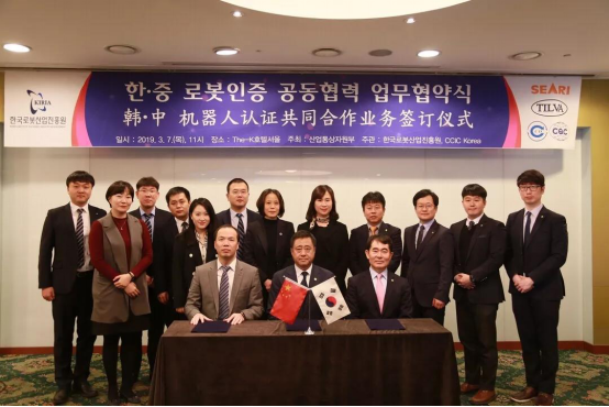 2018年5月24日,工业和信息化部部长苗圩与韩国产业通商资源部部长白云揆共同出席第三次中韩产业合作部级对话。双方就机器人、汽车等议题进行了广泛交流。苗圩部长指出,中韩两国都面临着如何通过结构性改革和产业转型实现经济可持续发展的重要任务,双方应加强发展战略对接,深化各领域合作,扩大互利共赢。希望双方在中韩产业合作部级对话机制下,增进两国主管部门交流,促进两国企业合作,推动两国产业合作迈向更新、更高的发展阶段。上电科集团与韩方相关机构签署三方协议2019年3月7日,在韩国产业通商资源部的牵头下,上海电器科学研究所(集团)有限公司(SEARI)(以下简称“上电科集团”)、韩国机器人产业振兴院(KIRIA)、中国检验认证集团韩国有限公司(CCICKOREA)在韩国首尔THE-K酒店,共同举行了“韩·中机器人认证共同合作业务签订仪式”。上电科集团副总裁王爱国、韩国机器人产业振兴院院长文全一、中国检验认证集团韩国有限公司总经理于开国共同出席签署了合作协议。通过该协议的签署,合作三方将就韩中机器人产品认证检测业务领域展开全面合作。上电科集团检测技术研究院院长刘健、市场部副部长许雯、上电科集团上海添唯认证技术有限公司常务副总经理易谦、副总经理郑海峰出席仪式。 上海电器科学研究所(集团)有限公司副总裁王爱国、韩国机器人产业振兴院院长文全一、中国检验认证集团韩国有限公司总经理于开国签订三方合作协议合作各方3月7日下午共同举办了“国际机器人标准认证技术研讨会”。上海电器科学研究所(集团)有限公司副总裁王爱国先生发表致辞中提到,中韩两国同处东亚地区,长久以来有着良好的经济贸易往来,双方在机器人领域各有特色,优势互补。希望中国机器人产品认证在各单位的支持和持续关注下,可以更好的协助韩国机器人企业发展同中国机器人产业的密切合作关系。也希望通过此次交流与合作可以让更多的韩国企业熟悉中国在机器人领域的需求和技术服务的能力,并与韩国相关方面建立合作和互信的机制,推动两国机器人行业在标准、检测、认证和培训等全方位的合作和交流。上海添唯认证技术有限公司副总经理郑海峰就中国机器人认证工作向韩方代表做了详细的介绍。并对机器人认证规划、标准采用、试验方法及其相关产业政策向与会人员做了充分的交流。韩国产业通商资源部、韩国电子情报通信产业振兴院、LG电子、三星电子、现代ROBOTICS、现代维亚等80多家政府机构及企业单位参加了本次研讨会。主办方各代表就中韩两国相关产业动态、发展趋势、机构性质等进行了详细介绍。上电科集团参观访问中检集团韩国有限公司上电科集团参观访问中国检验认证集团韩国有限公司,参观了中检集团韩国有限公司的试验室。双方本着优势互补、互利共赢的愿景共同探讨推动韩中机器人产品检测认证工作。 上电科集团领导参观访问中检集团韩国公司上电科集团参观访问韩国机器人产业振兴院3月8日下午电科集团参观访问韩国机器人产业振兴院,到访人员一行参观了韩国机器人产业振兴院在机器人方面的测试试验室。双方就韩中机器人产品在检测、认证、标准方面的工作深入的交换了意见,为三方战略合作建立了牢固基础。 上电科集团领导参观访问韩国机器人产业振兴院
